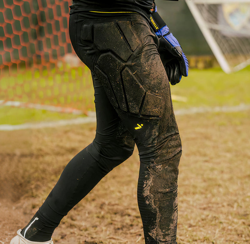 Goalkeeper leggings with XRD® padding, built-in shin guard pocket, and form-fitting design for comfort and protection.